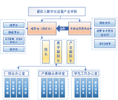 新农人数字化运营产业学院强化高校、合作企业、地方政府、行业协会的多元主体协同作用,“政”、“校”、“企”、“协”多维联动,现代产业学院成立理事会,实行理事会领导下的院长负责制。理事会由7名理事组成,其中球友会3人,好品文化发展有限公司3人,政府1人。产业学院院长兼任本着合作共赢的原则,积极推进现代产业学院的建设与改革。如图1所示。