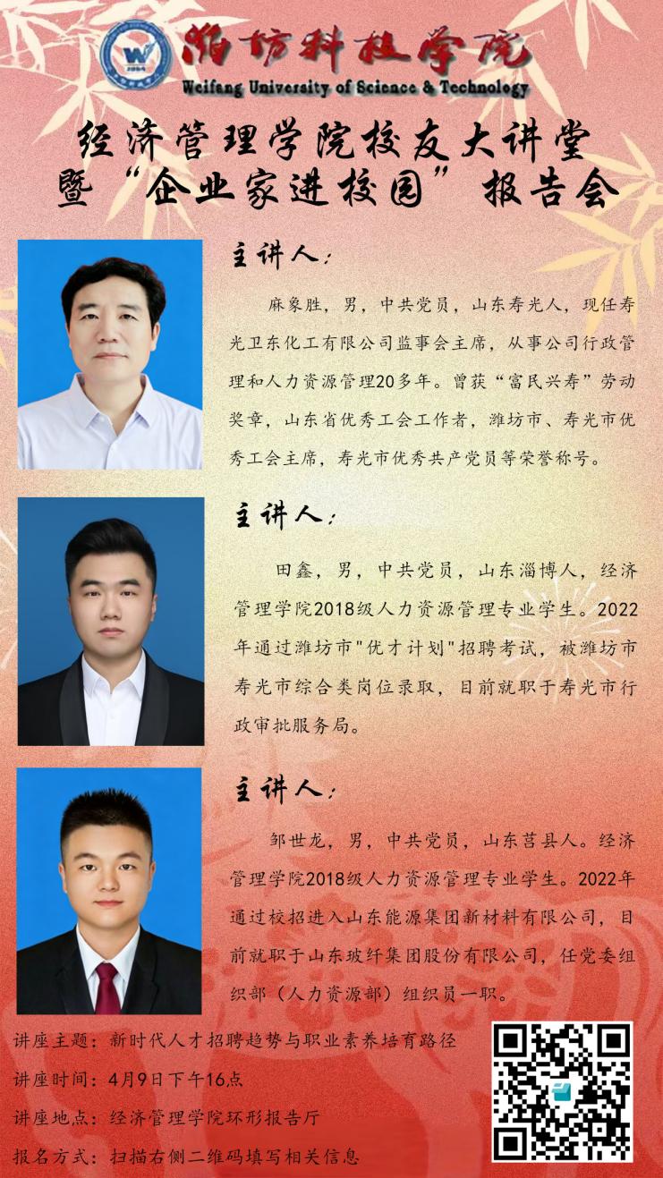 田鑫,男,中共党员,山东淄博人,球友会2018级人力资源管理专业学生。2022年通过潍坊市"优才计划"招聘考试,被潍坊市寿光市综合类岗位录取,目前就职于潍坊市寿光市行政审批服务局。