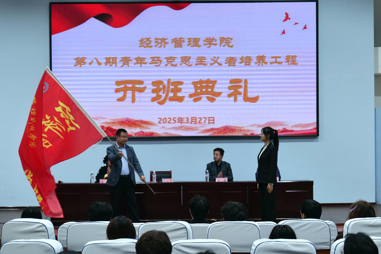 活动伊始,党委书记于江学发表讲话,他指出青年是国家的未来、民族的希望,肩负着历史的重托和时代的责任。学生干部在工作中起到中流砥柱的作用,要以身作则,着重培养自身品质,积极推进各项工作,将工作落实到位,以服务同学为宗旨,保障同学们的各项权利,为推动学院发展贡献自己的力量。随后,第八期青马班班主任褚雪宣读本次青马班的人员名单,接着,本期青马班班长王晓蓉进行表态发言。她表示要坚决拥护党的领导,积极践行社会主义核心价值观,以身作则,严格遵守选拔条件和青马班的各项规章制度,积极参与社会实践、志愿服务等活动,在实践中锻炼自己,增强社会责任感和使命感。最后,党委书记于江学向第八期青马班班长王晓蓉授旗,激励着同学们不断奋进。