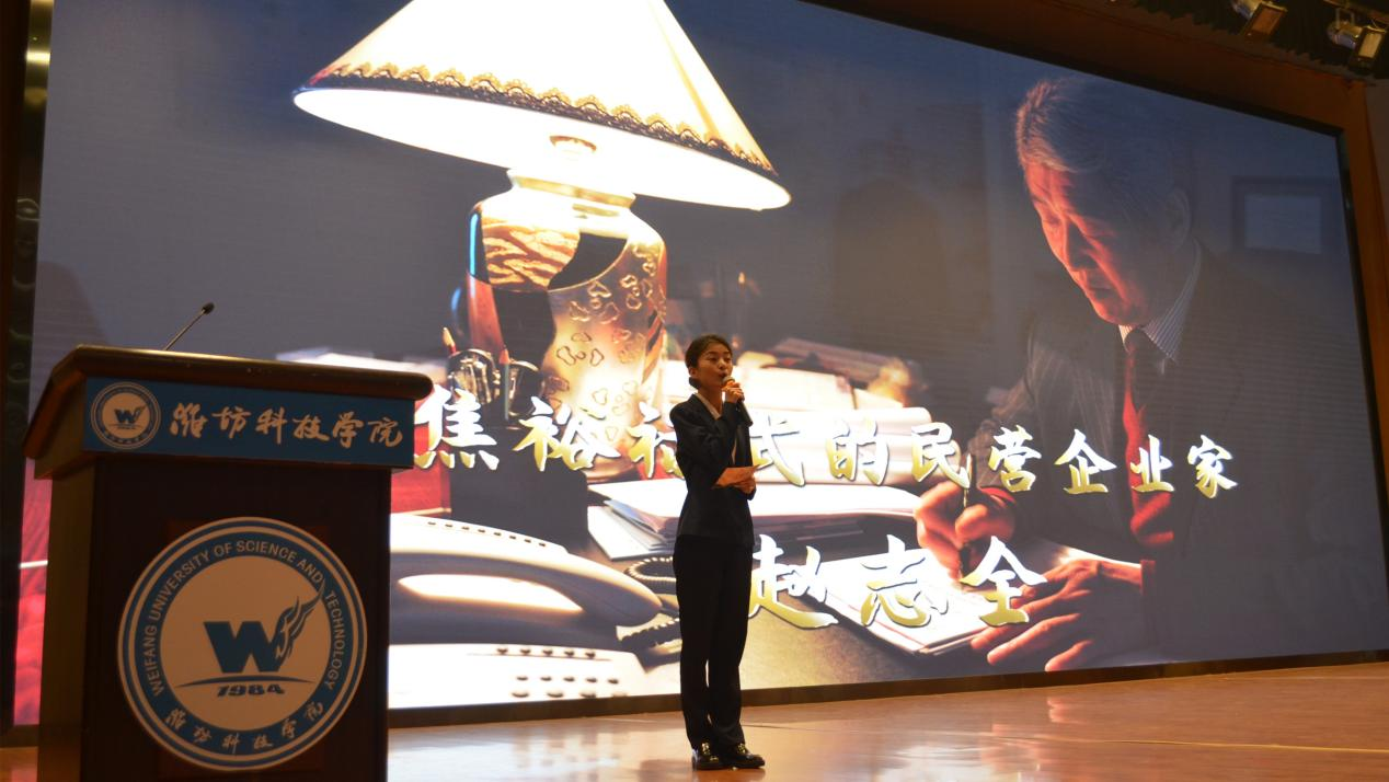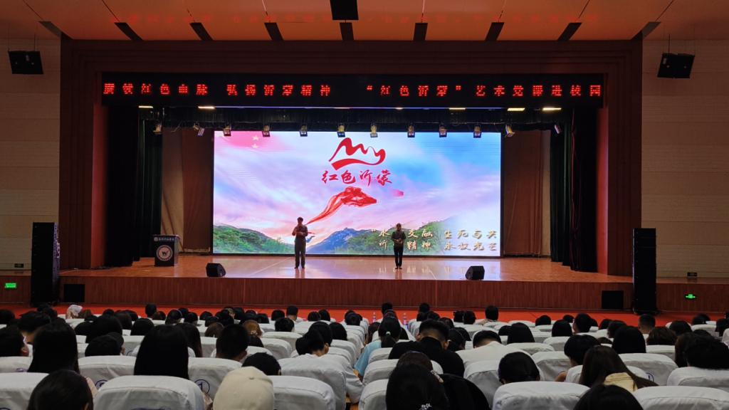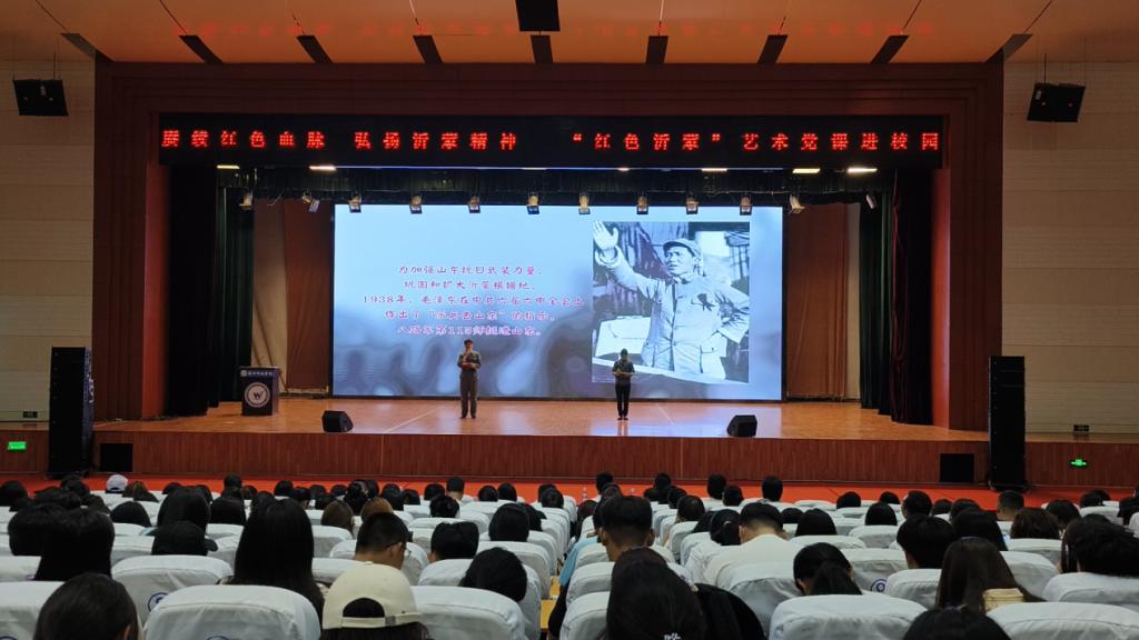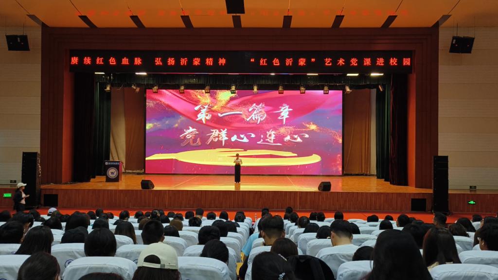随后,沂蒙精神宣讲团作主题宣讲。宣讲团成员采用配乐朗诵、情景再现、角色扮演等艺术手法,配合大量音视频文件,分别从“党群心连心”“拥军勇支前”“日月换新天”“时代谱新章”四个篇章,生动讲述了革命战争年代沂蒙地区党为人民浴血奋战,为人民谋解放、谋幸福,人民坚定跟党走的感人故事,涌现出“沂蒙红嫂”“沂蒙六姐妹”等拥军支前、奋勇抗战的先进模范,歌颂了社会主义建设初期和改革开放时期,沂蒙人民在党的带领下战天斗地、改天换地、用勤劳和智慧创造幸福生活的伟大壮举,演绎了时代楷模赵志全积极践行沂蒙精神、天下为公、艰苦创业、无私奉献的光辉事迹,呈现了“党群同心、军民情深、水乳交融、生死与共”的沂蒙精神。在宣讲团激情澎湃、声情并茂的的讲述下,“沂蒙精神”深深感染了在场的每一位师生,现场多次响起热烈的掌声。最后,在宣讲人的倡议下,全体师生肃然起立,用嘹亮的歌声共同歌唱《跟着共产党走》。