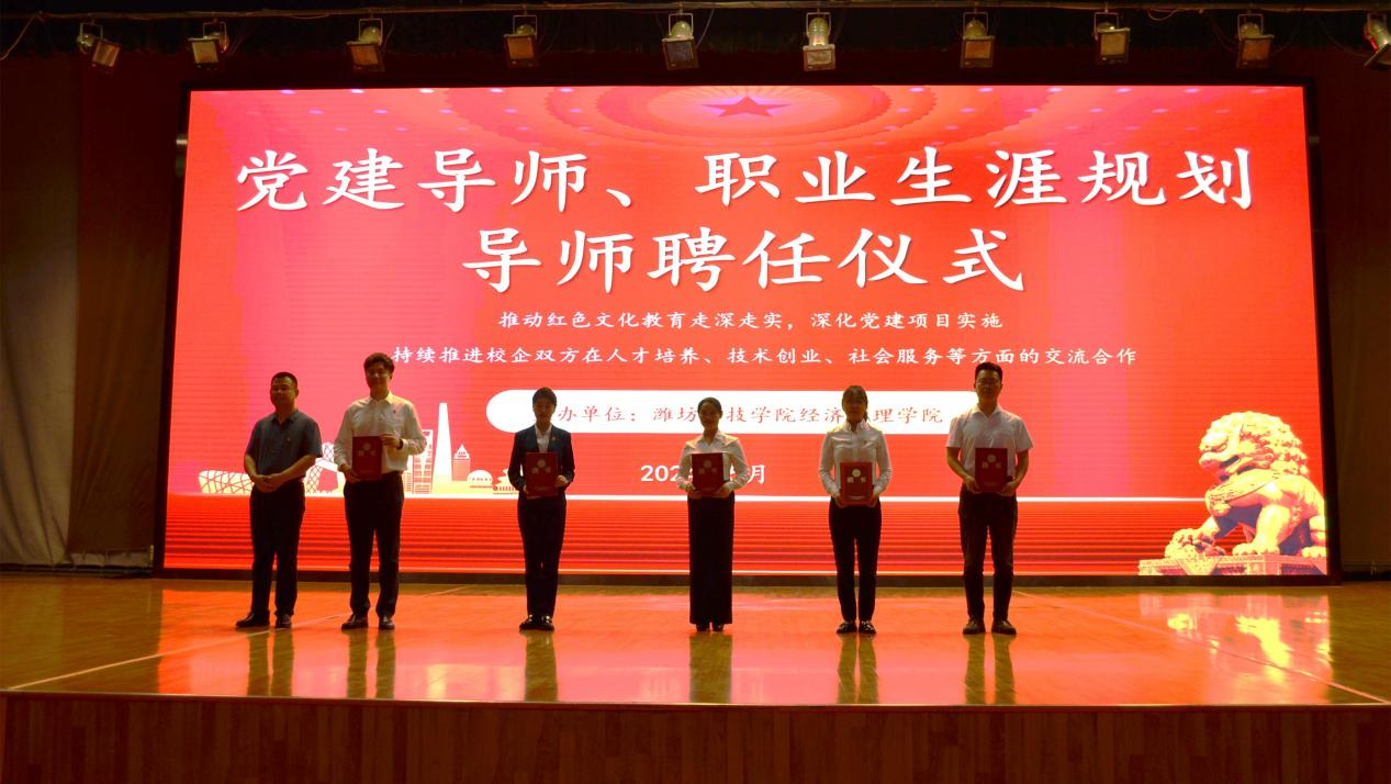 为加强我院党支部建设,全面提升我院党建工作水平和育人实效,特聘请沂蒙精神宣讲团周良怡、袁滨、卫泓辛、张兴林四位讲师为我院党建导师,聘请鲁南制药集团人力资本中心招聘经理徐阳为我院职业生涯规划导师,由党支部书记于江学颁发聘书。