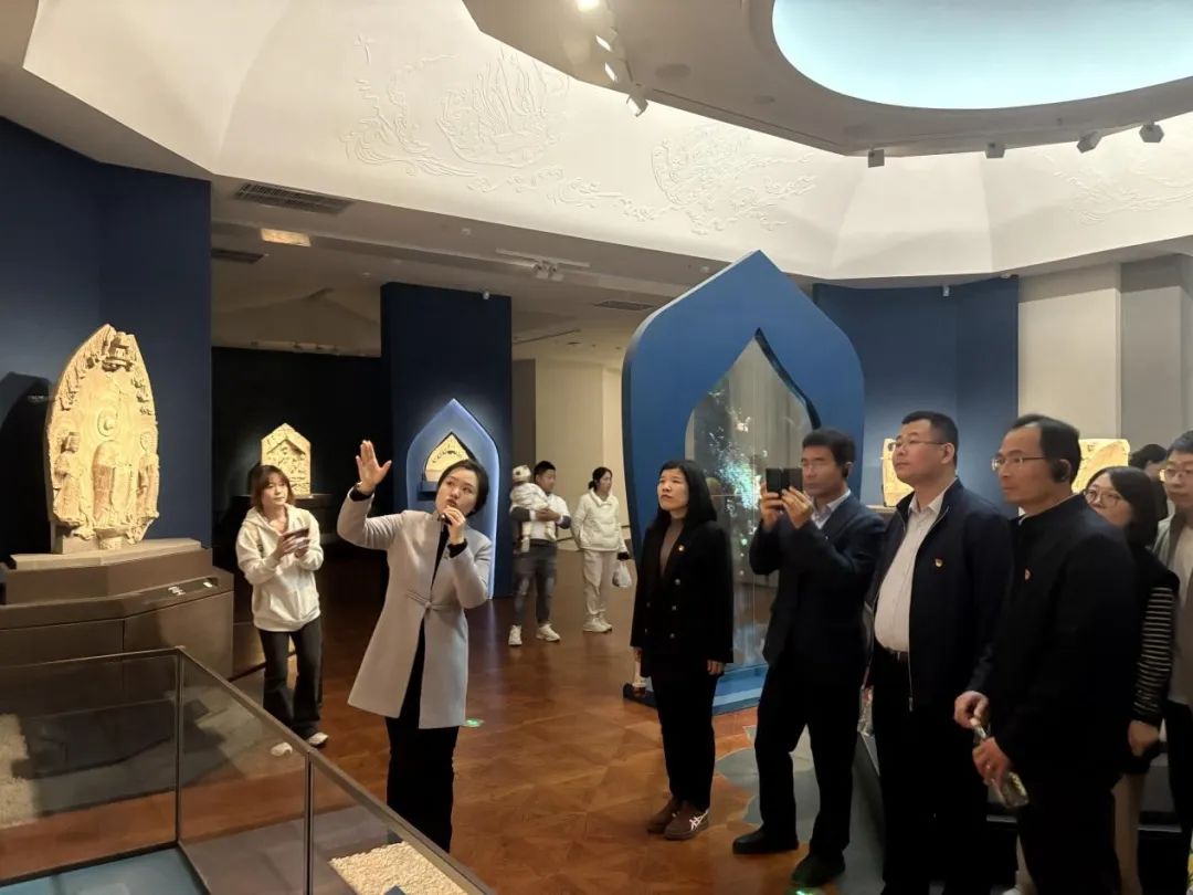 青州博物馆作为全国唯一县级国家一级博物馆,馆藏文物 6 万余件,其新馆以汉唐建筑风格为基调,通过 “高台、阙楼、坡屋顶” 的设计语言,将传统美学与现代科技完美融合。在解说员带领下,教师依次参观了青州历史展厅、龙兴寺佛像展厅等特色展区。在东汉 “宜子孙” 玉璧前,大家驻足聆听文物背后 “子子孙孙宜室宜家” 的美好寓意;在明代赵秉忠殿试卷前,共同感受科举制度下知识分子的家国情怀;在龙兴寺佛教造像群前,惊叹于跨越 500 年的艺术瑰宝如何见证多元文化交融。教师有序参观、聚精会神地观看每一处展览,细心聆听解说员的讲解,感受青州历史文物的文化魅力,共同追溯青州这片古老土地上深厚的文化底蕴。在自主参观时,部分教师就如何将博物馆资源转化为教学案例展开热烈讨论,提出可开发 “文物里的经济学”、“非遗与乡村振兴”等特色课程,引导学生从历史维度理解现代经济现象。