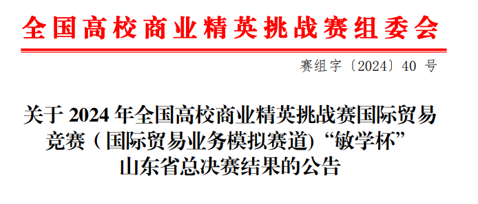 近日,由中国国际贸易促进委员会商业行业委员会、中国国际商会商业行业商会、中国商业经济学会、中国会展经济研究会联合主办的国家级学科竞赛活动,即2024年全国高校商业精英挑战赛国际贸易竞赛(国际贸易业务模拟赛道)山东省总决赛圆满落幕。我校球友会参赛的16支队伍,荣获一等奖13项,二等奖1项,三等奖2项,学校获“优秀组织奖”,获奖数量和质量再创历史新高!