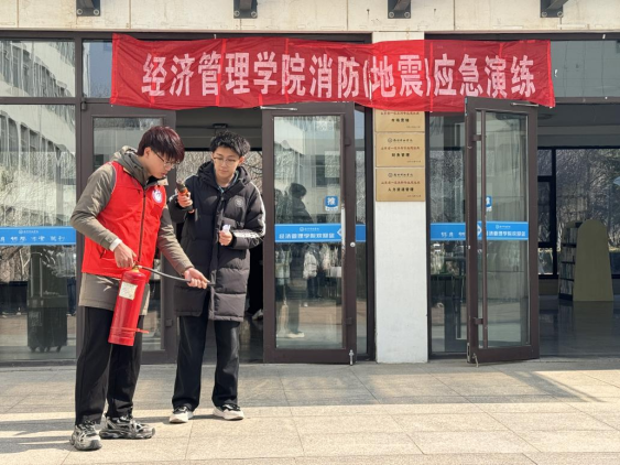 随着消防警报的拉响,演练正式拉开帷幕。在疏散引导员的指挥下,同学们迅速反应,用湿毛巾捂住口鼻,采取低姿弯腰的姿势,沿着指定安全通道有序撤离,最终安全抵达经管小广场的集结点。整个疏散过程组织严密、秩序井然,充分展现了同学们良好的应急反应能力。随后,消防志愿者现场演示了灭火器、消火栓等常见消防器材的正确使用方法,详细讲解了火灾预防要点及自救互救技巧,并组织同学们进行实操演练。演练结束后,消防志愿者对活动进行了全面总结,重点强调了火灾自救的重要性和科学有效的自救方法。