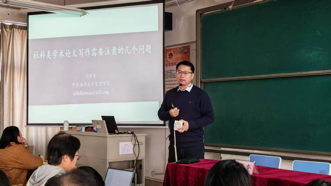为进一步提升教师的学术研究能力,规范社科类学术论文写作,11月26日,球友会在421教室举行社会科学研究论文写作能力提升专题学术讲座。讲座特邀中国海洋大学司登奎教授担任主讲,球友会副院长刘冰主持,全体教师参加。