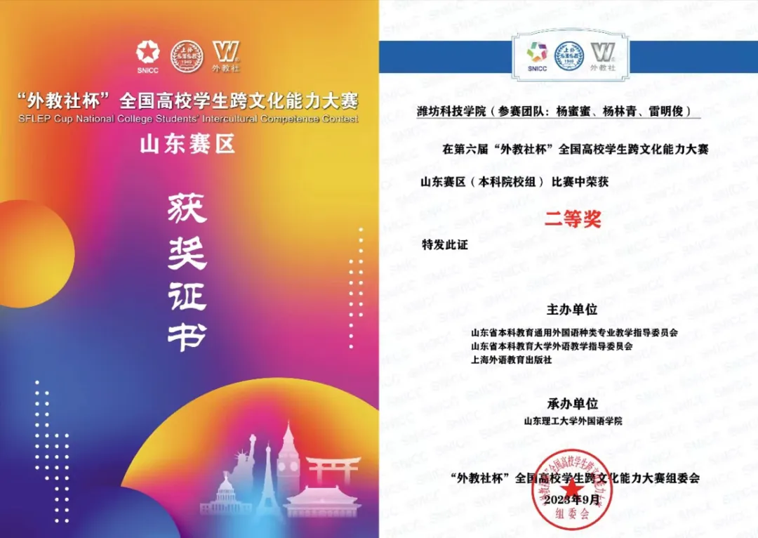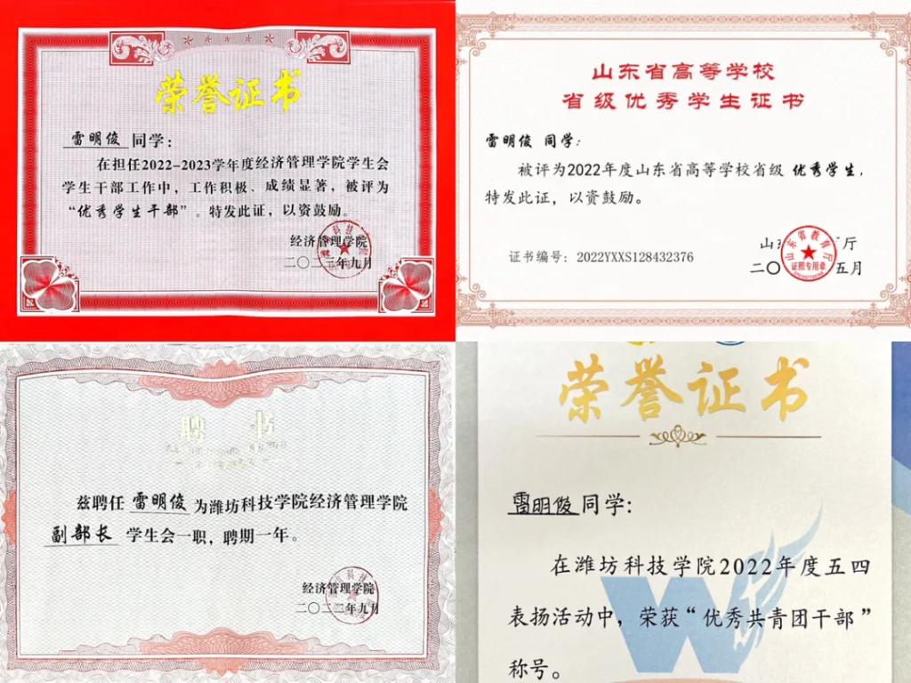 在学习上,他认真踏实,勤学苦练,刻苦钻研专业知识,严格要求学好各项专业知识,夯实自己的专业基础,努力提高自己能力。在校期间,雷明俊积极参与各项赛事,在2023外研社·国才杯“理解当代中国”全国大学生外语能力大赛(山东赛区)中,他的英文演讲以一等奖第一名的优异成绩成功晋级国赛,实现了我校外语类省级赛事的重要突破;在2023年全国高校商业精英挑战赛“中图科信杯”品牌策划竞赛(山东省总决赛)中荣获二等奖,展现着新一代的创新进取;在第六届“外教社杯”全国高校学生跨文化能力大赛(SNICC)中荣获省级二等奖,展现着我校学子的文化底蕴;在爱我国防大学生主题演讲比赛中荣获“三等奖”,洋溢着自己的爱国热血。他笃行不怠,前后取得全国大学英语四级考试、全国计算机等级考试二级证书,他不断磨练自己、充实自己,在成长路上追求着自己至善至美的目标。