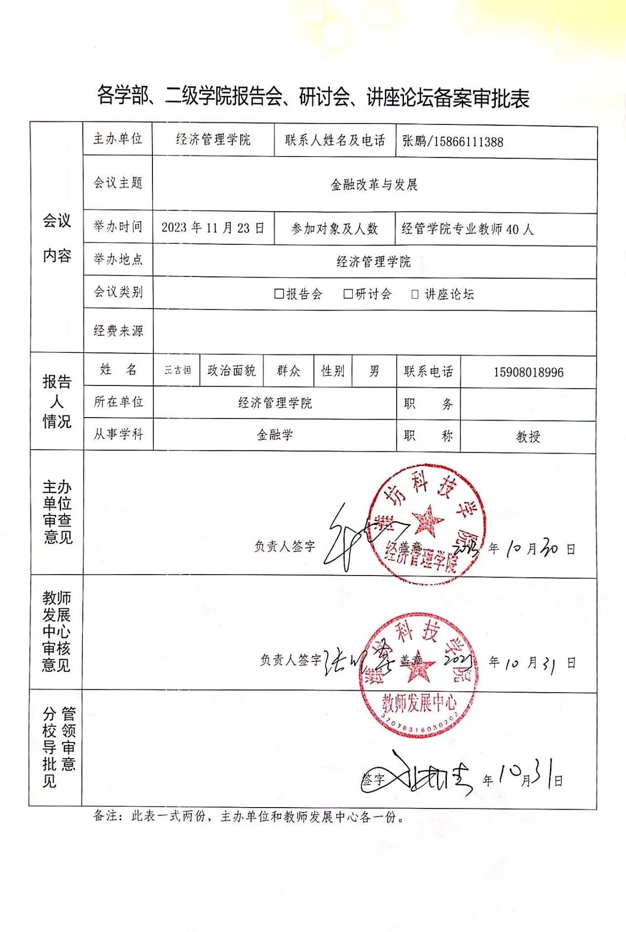 11月10日下午,球友会邀请王吉恒教授作《金融创新与发展》学术讲座,张鹏副院长主持本次讲座,经济系农林经济管理专业教师、部分高层次人才参加本次讲座。